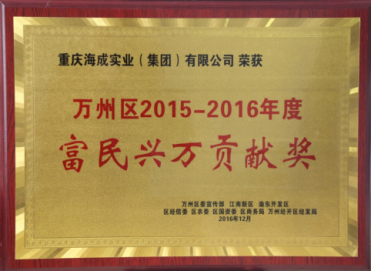 2016年12月9日,由区委宣传部、江南新区、渝东开发区、区经信委、区农委、区国资委、区商务局、万州经开区经济发展局主办的2015—2016年度富民兴万贡献奖颁奖大会在万州区委中型会议室隆重举行,重庆海成实业(集团)有限公司以唯一房地产企业入围获奖。