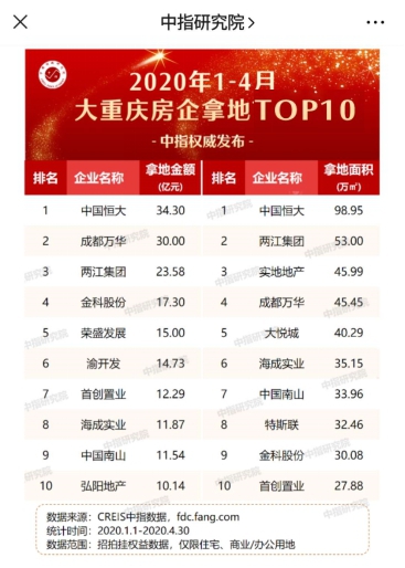 近期,中指研究院发布了2020年1-4月大重庆房企拿地TOP10,海成集团以拿地金额11.87亿、拿地面积35.15万㎡ 进入TOP10 。