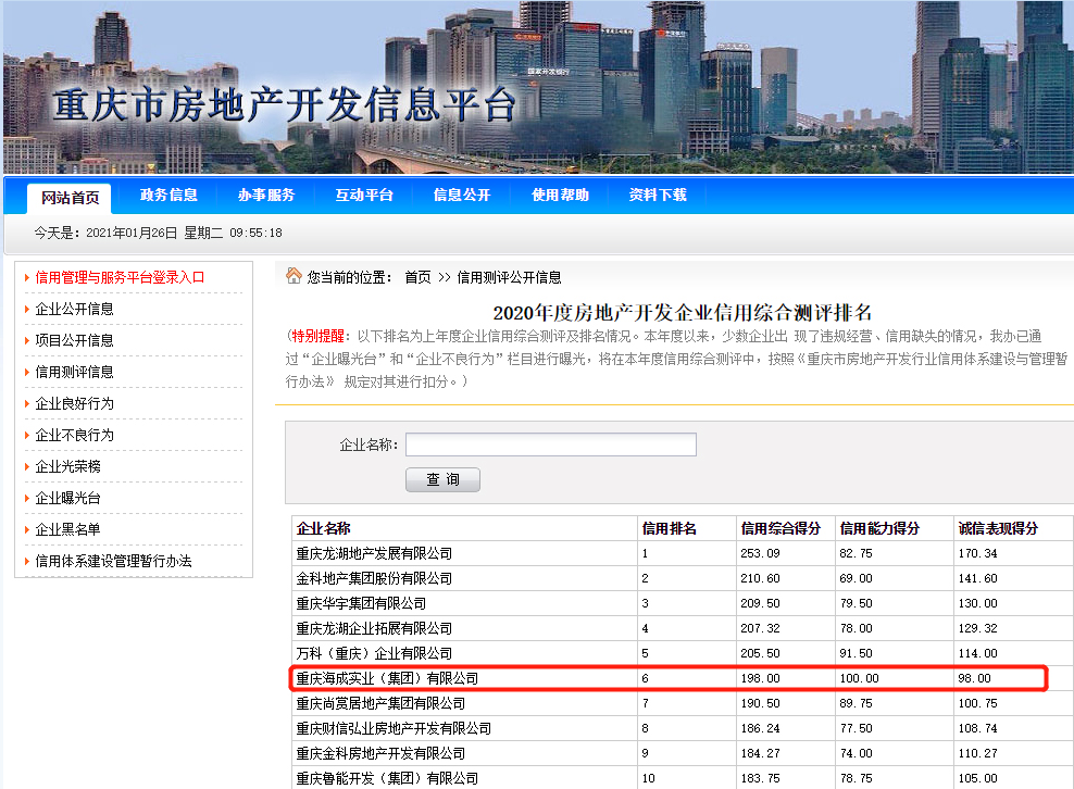 近日,重庆市房地产开发信息平台,基于《重庆市房地产开发行业信用体系建设与管理暂行办法》规定,对外发布《2020年度房地产信用综合测评排名》,海成集团荣膺第6名。