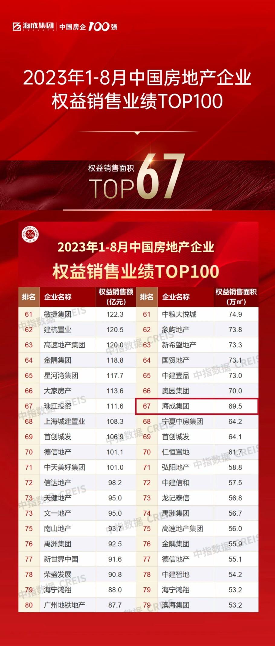 在稳健发展的战略框架下,海成坚持长期主义,不盲目扩张,专注提升产品力、服务力。以69.5万㎡的销售面积,位列1-8月全国房企权益销售面积TOP67。