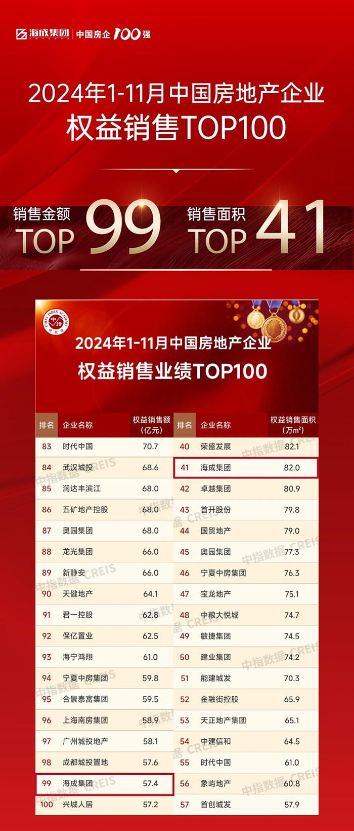 海成集团位列1-11月全国房企销售面积TOP50、销售金额TOP109;权益销售面积TOP41、销售金额TOP99