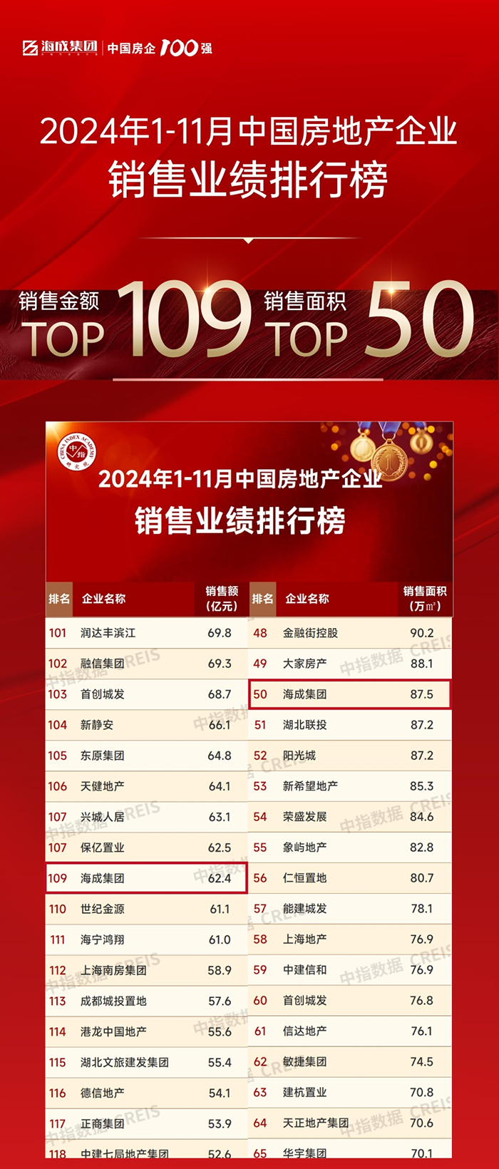在中指研究院最新数据中,海成以62.4亿元的销售额,位列1-11月全国房地产企业销售业绩榜第109名;以87.5万㎡的销售面积,位列1-11月全国房地产企业销售业绩榜第50名。