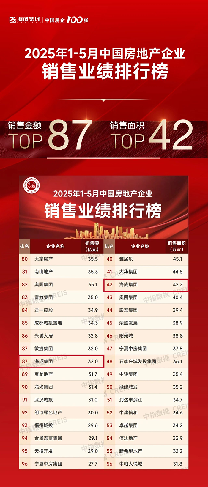 行稳致远 | 海成集团位列1-5 月全国房企销售面积TOP42、销售金额TOP87