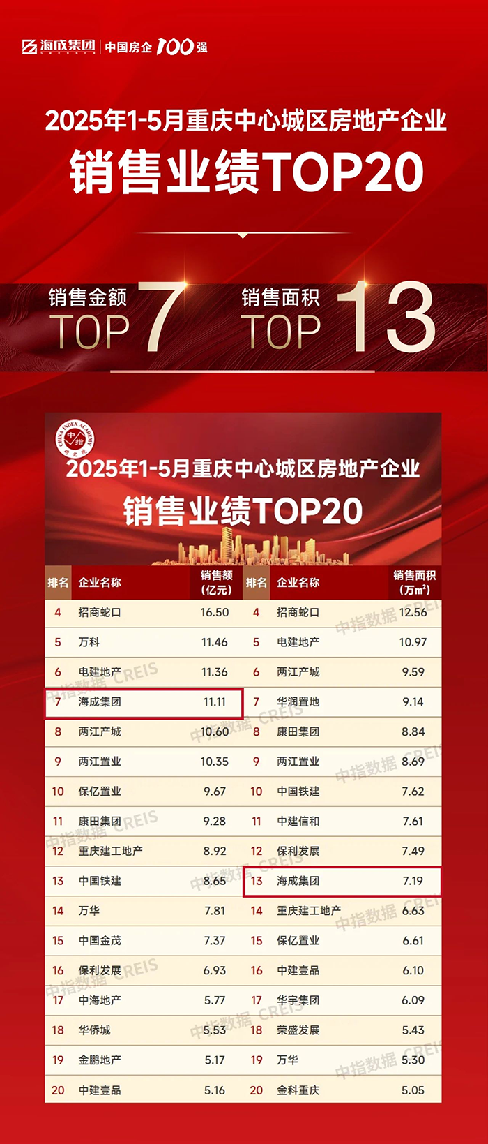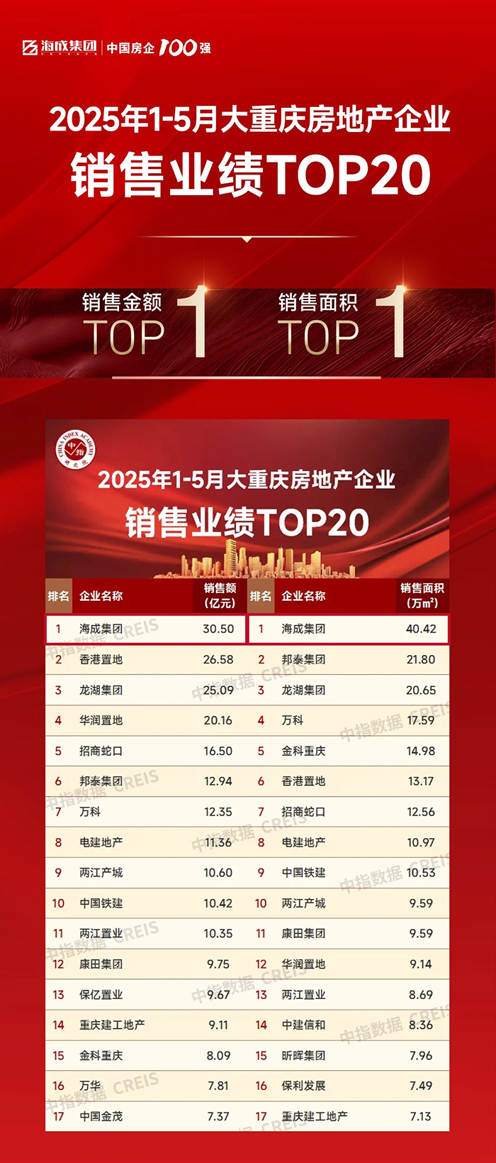 海成坚持以产品力优先,客户优先的秉持,赢得了市场和客户的充分认可。在中指研究院最新数据中,以30.50亿元的销售金额、40.42万㎡的销售面积,位列2025年1-5月大重庆房地产企业销售业绩榜面积榜双冠第一。