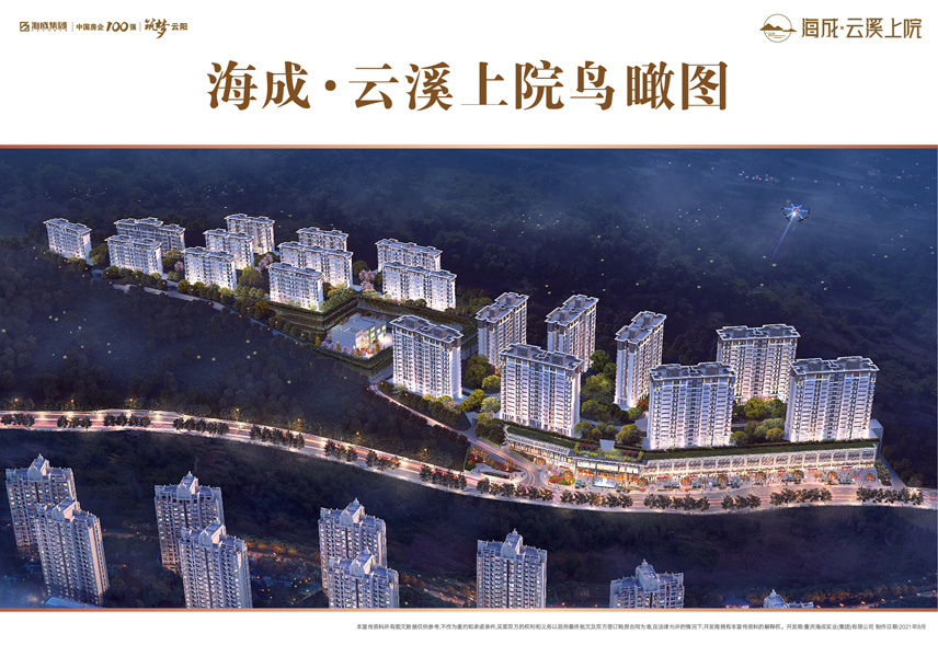 海成·云溪上院,系百强海成在云阳打造的首个高端住宅项目,位处北部新区中芯、半山之上,视野极佳,可俯阅江河。项目总建筑面积约17.9万方,由11栋洋房及8栋洋楼组成,绿化率超30%,容积率低至1.7,同时内部规划幼儿园,项目采用智慧体系,打造4大主题架空层、综合健身场、儿童游乐场、健身跑道等, 全面满足业主高品质生活所需。