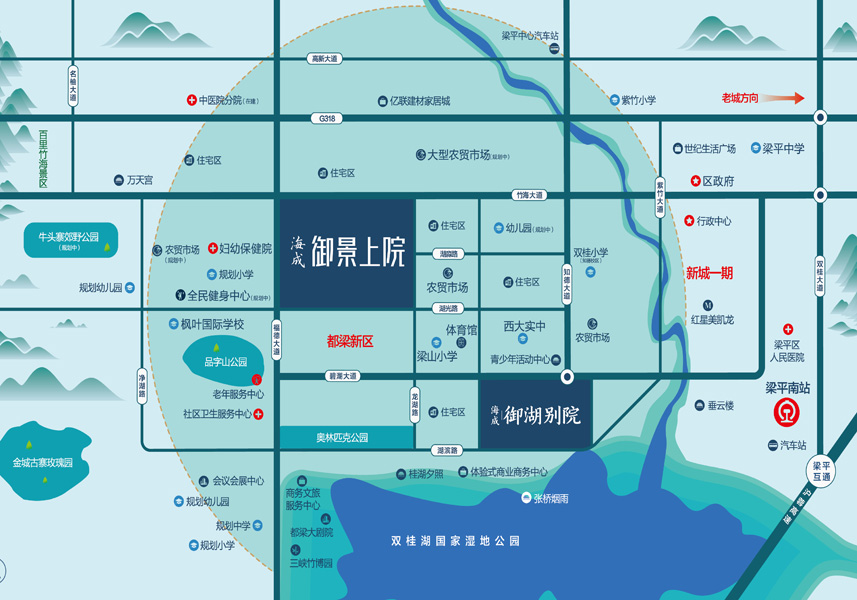 海成御景上院,百亿海成深耕梁平,择址双桂湖智创生态城,倾力打造18万方宽境生活作品,是继海成御湖别院之后的升级版人居范本。项目以南北朝向的规划、宽阔楼间距、以及30%的绿化率、打造高端低密住区,承载舒居美好生活。
